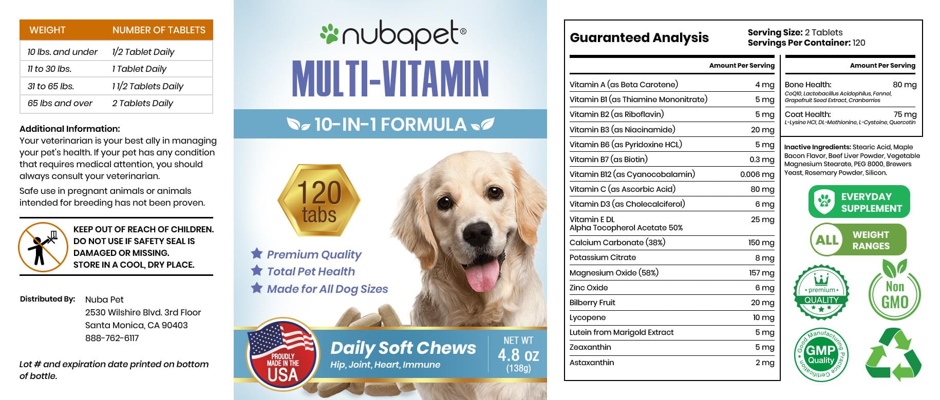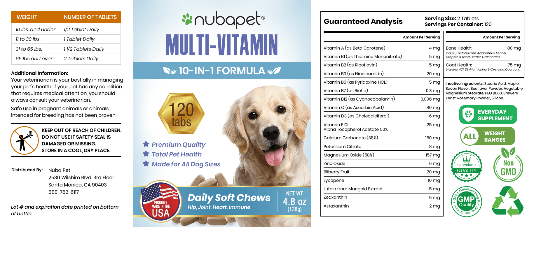 Nubapet Multi-Vitamin is a 10-in-1 supplement specifically formulated to keep your dog in your arms for years to come.
